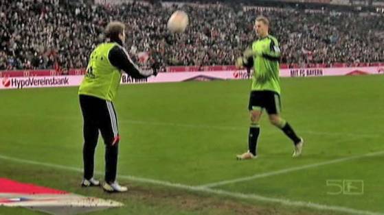 Neuer: Ei bine, pot sa explic asta pentru ca ar putea fi interpretata ca aroganta. Nu este asa. Din timp in timp simt nevoia sa am mingea in maini. Nu este usor sa nu prea atingi mingea 70 de minute. (Scena de mai jos a fost surprinsa in min. 70 la meciul Bayern – Schalke 4:0, timp in care Neuer facea pase cu Muller in timpul meciului – n.m.)