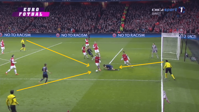 In minutul 38, Toni Kroos ofera o pasa de geniu prin care il pune pe Arjen Robben in situatie clara de a marca. Olandezul este faultat dur de portarul advers, obtinand totodata cartonasul rosu pentru Szczesny si un penalti. David Alaba trimite neinspirat in bara iar scorul ramane 0-0.